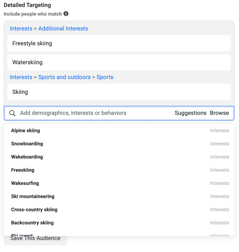 Suppose you want to show ads to those who are into skiing. In this case, you need to choose interests from the topic of skiing. These can be either very broad interests with a large number of users, or, on the contrary, parameters that will narrow down the audience.